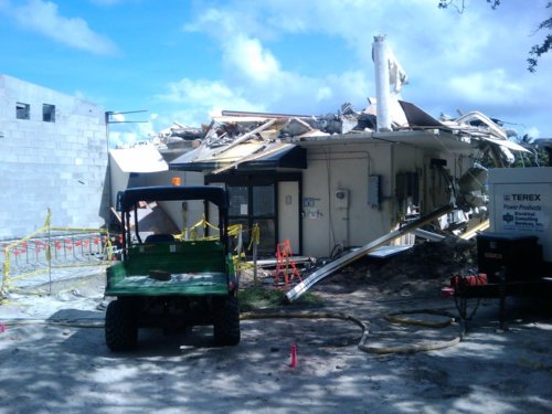 Now, the really fun part (or the sad part if you were really attached to that library). The next two pictures show, from two different directions, the one remaining jagged piece of the library that was the last piece to be left standing, along the northwest corner. The third picture after that shows the same area, after that last jagged piece was knocked down.