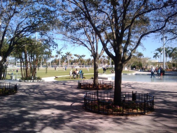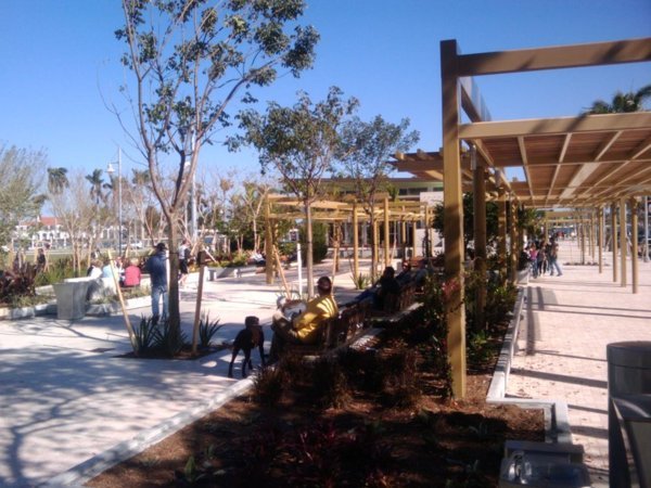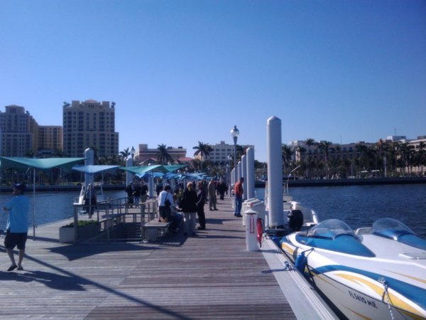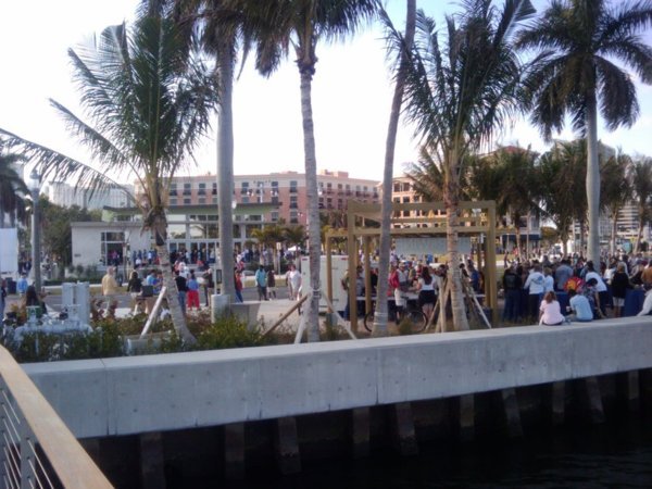 This page will have pictures of the final completed Clematis Street waterfront project in downtown West Palm Beach. Some of the pictures were taken early Sunday morning, the day after the big opening ceremony, after things had quieted down, leaving only the picturesque scenes without the crowds. Other pictures were taken on Saturday afternoon, near the beginning of the opening festivities, when large crowds were present all around the area. Since that time, there has been a constant flow of people coming to check out the waterfront, providing a nice happy medium between crowded and empty. The last seven pictures show the waterfront on a normal Sunday afternoon, eight days after opening, still drawing many families, kids, dogs, etc.